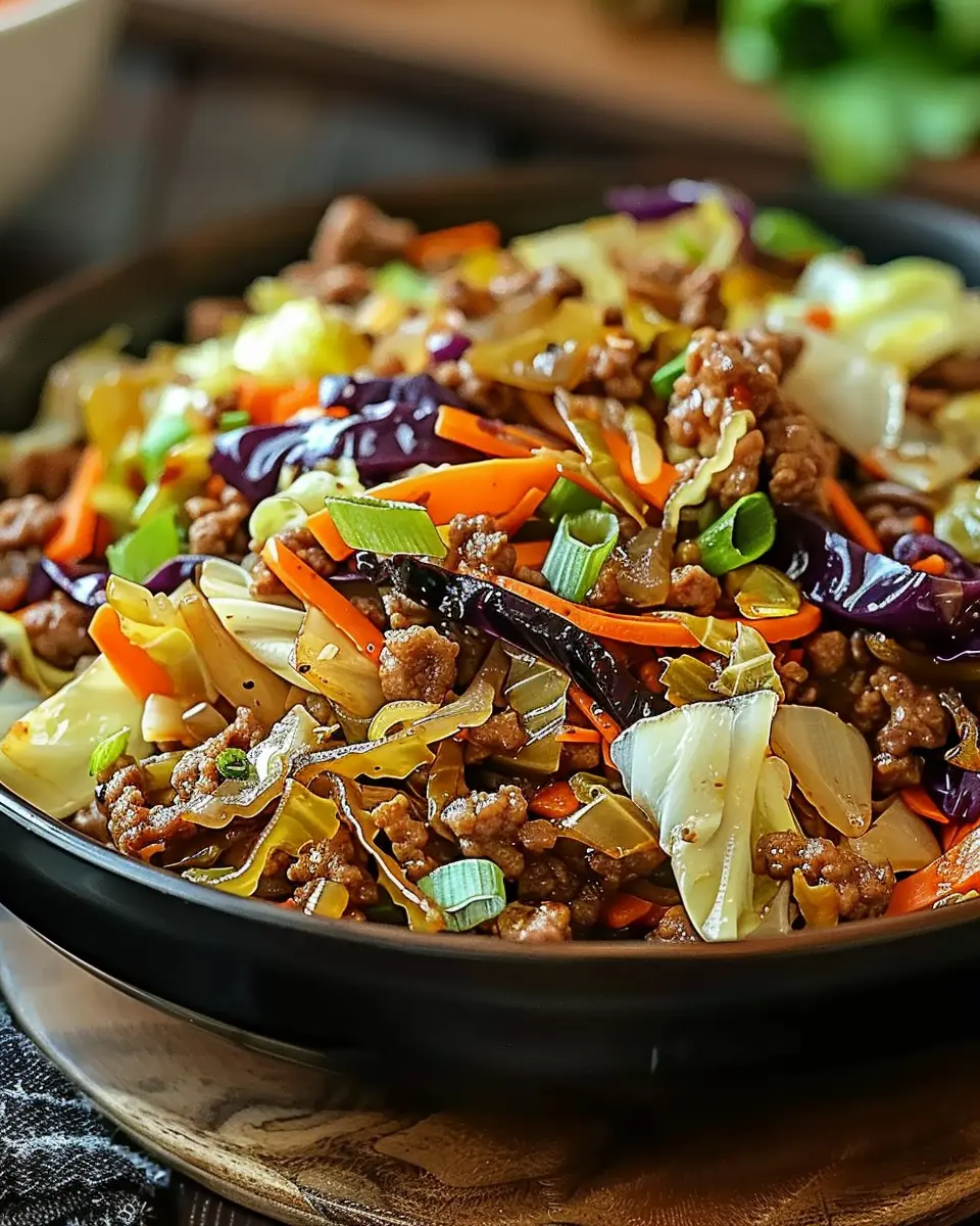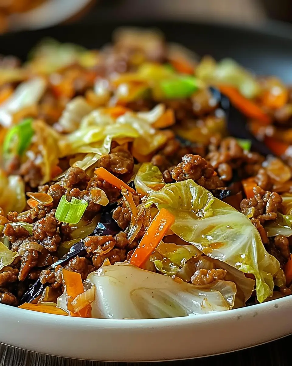 A delightful stir-fry recipe featuring ground beef and cabbage, highlighting savory flavors and ease of preparation.