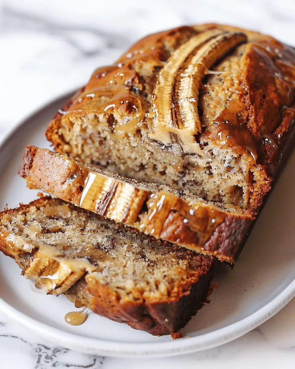A deliciously moist and fluffy banana bread with a hint of honey and vanilla, perfect for breakfast or as a snack.